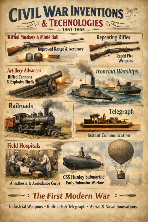 Some of these technologies were entirely new and laid the foundation for modern warfare and modern system of communications. Others were being used in a war for the first time and proved very useful. Following are some of the most important technologies and inventions used during the American Civil War.
