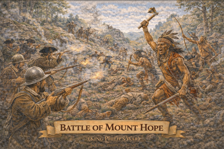 The Battle of Mount Hope was a battle fought during King Philip’s War in the 17th century. In this battle, English colonists were able to find the Native American leader Metacomet and capture him. Metacomet was also known as King Philip and the war was named after him.