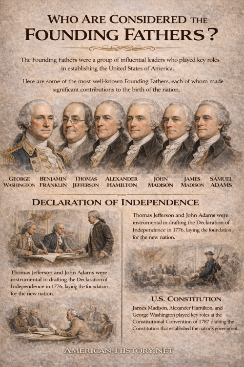 The Founding Fathers of the United States were a group of influential political leaders, statesmen, and revolutionaries who played a central role in achieving American independence and establishing the foundations of the United States government. Active during the American Revolution (1775–1783) and the nation-building period that followed, they helped guide the Thirteen Colonies through rebellion, war, and the creation of a new constitutional system. Their ideas and decisions continue to shape American democracy today.