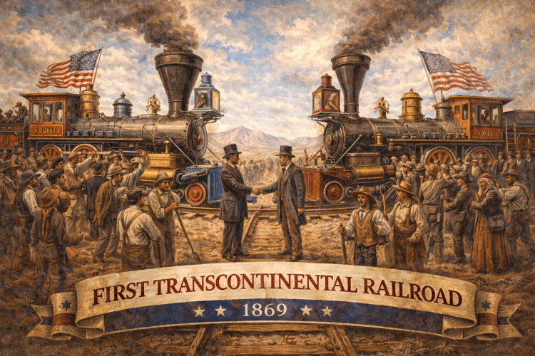 Completed in 1869, the First Transcontinental Railroad connected the eastern rail network at Council Bluffs, Iowa, to the Pacific Coast near San Francisco Bay. Built by private companies with substantial government subsidies, it transformed the national economy.