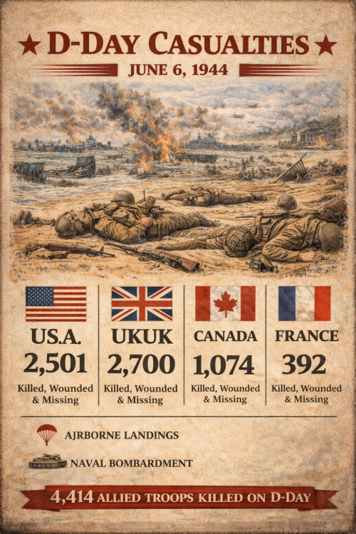 Around 156,000 Allied troops landed on Normandy on D-Day. These included American, Canadian and British soldiers. The American forces landed about 73,000 troops, British forces landed 61,715 troops, and the Canadian troops numbered around 23,000. During the Battle of Normandy, nearly 425,000 combined troops on both sides were killed, wounded, or went missing. This figure includes the total casualties for both Germans and the Allied forces by the end of Operation Overlord.