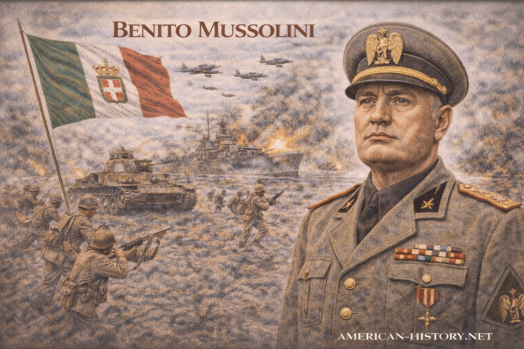 Benito Mussolini was the fascist leader of Italy from 1925 to 1945. He led the country through the World War II and remained one of the closest allies of Adolf Hitler and Nazi Germany. Mussolini championed a dictatorial style of leadership that suppressed all opposition and used nationalist hyperbole to achieve political and military ends.